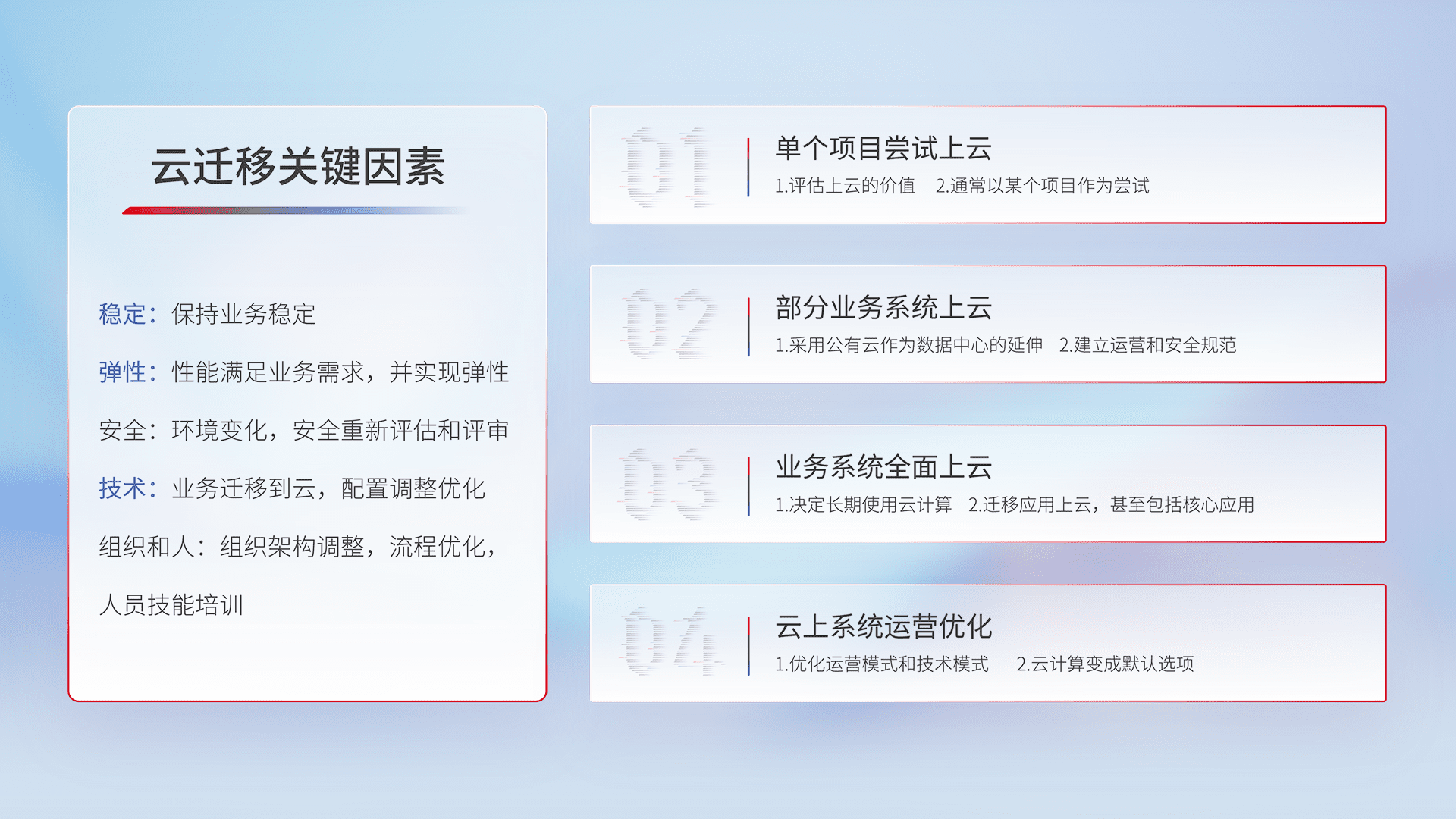结合实际业务,,,,从规划设计、、、云平台选型、、云原生改造、、、数据迁移、、、、集成交付,,,,迁移全过程为客户识别最佳上云路径,,,做好风险识别管理,,设计网络架构、、、身份权限、、、、安全审计合规、、、、操作审计、、、、日志审计、、、监控告警策略、、多站点容灾设计等,,,,对云上基础设施进行整体规划,,,提升IT治理水平,,以满足弹性、、、高可用、、高性能的需求。。