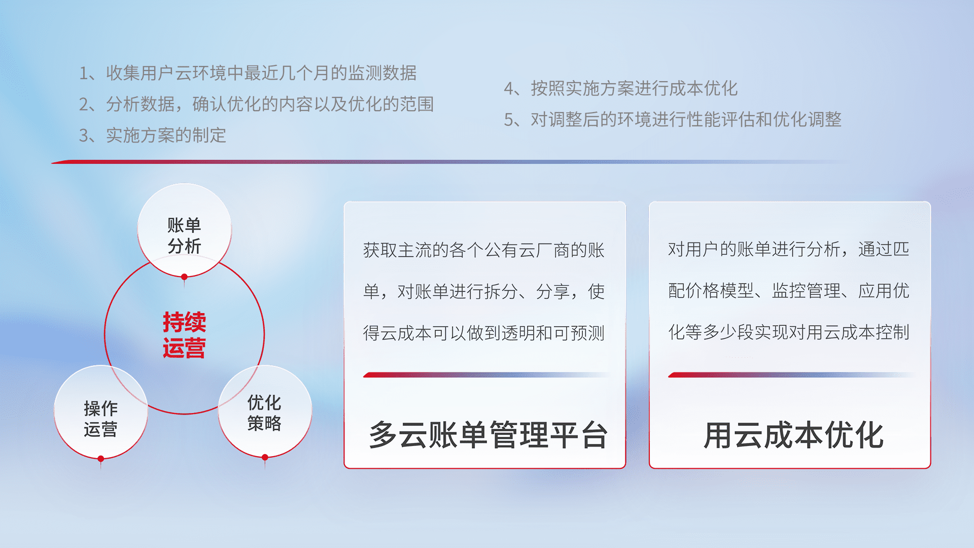 通过多云纳管,,,以统一的资源数据模型把客户的云资源进行抽象和封装,,进而实现对多云资源的统一操作,,,保障云资源管理的可靠性、、稳定性与可用性。。。。量身定制化运维内容,,配置、、、开发运维、、补丁管理、、备份、、、监控、、、、认证和访问管理、、审计和日常巡检等,,,保障在用云过程中的可靠度,,,稳定度以及高可用率。。