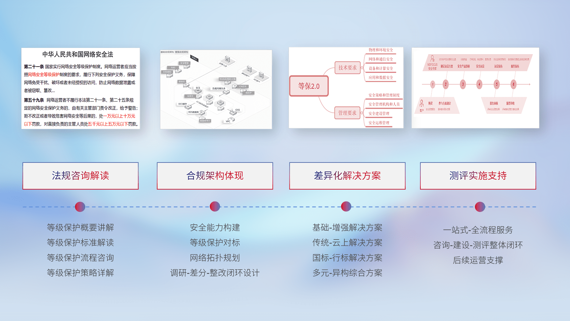 通过专业的法律咨询解读、、、合规架构体现、、、、差异化解决方案、、测试实施支持等服务,,为客户量身打造等保合规体系。。。