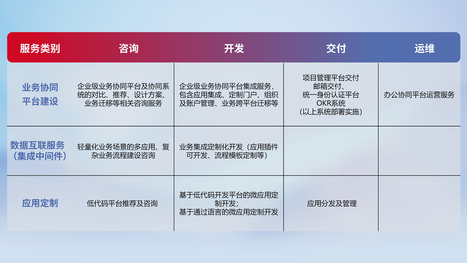 针对钉钉、、、企微、、IDaas等平台级产品提供产品的规划、、、方案、、、、交付、、、、定制化开发等服务,,实现如统一协同办公、、智能客户服务、、、混合会议管理、、、智能数据查询、、等业务场景,,实现数字化转型。。